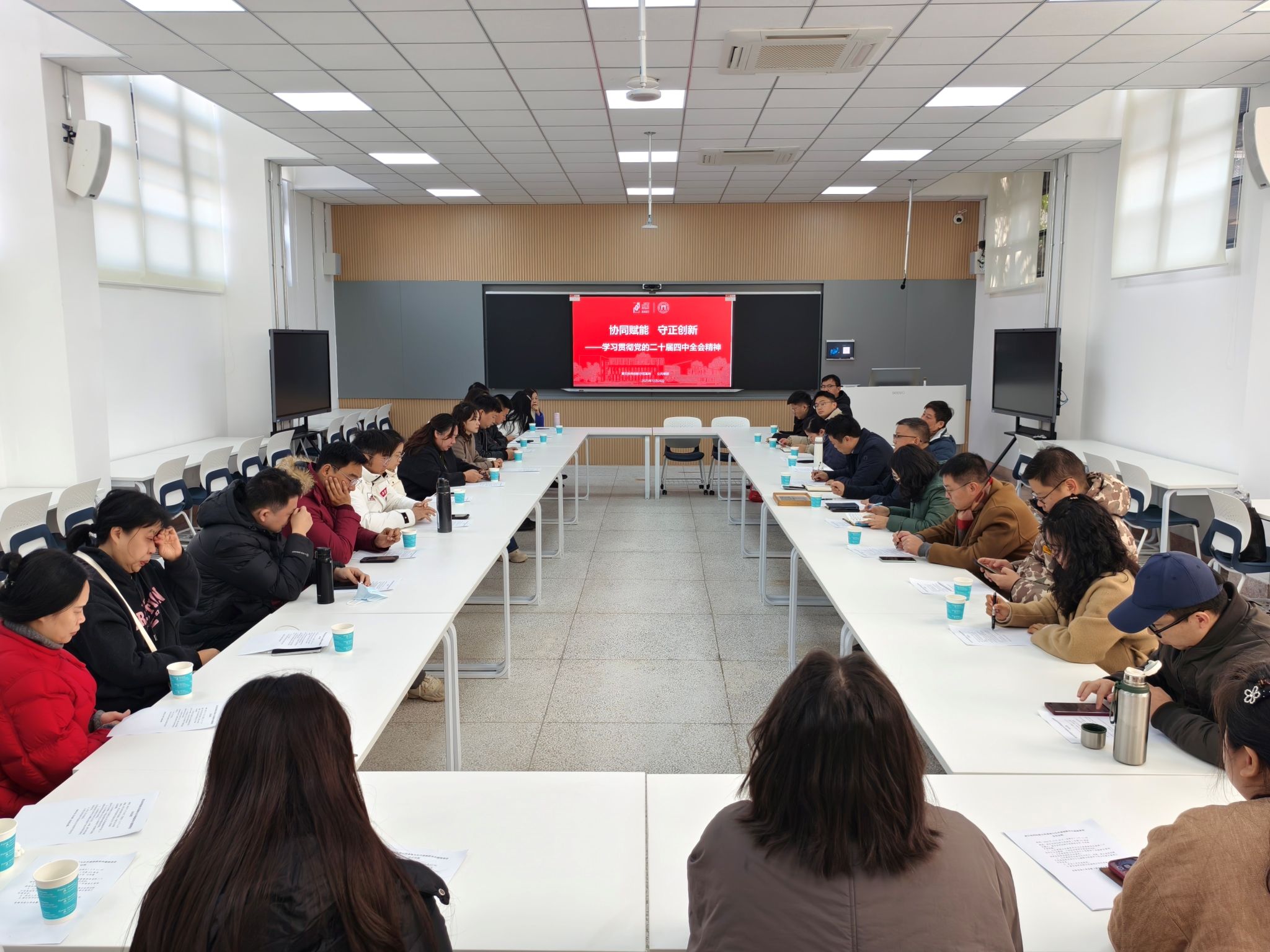12月26日,在公共课部主任兼党总支书记周捷峰和副主任毛凤凡的带领下,公共课部两个教师党支部、四个教研室一行26名党员和教师赴黄石协同创新示范基地开展“协同赋能 守正创新——学习贯彻党的二十届四中全会精神”联学共建交流活动。座谈会由黄石协同创新示范基地主任刘岸雄主持。