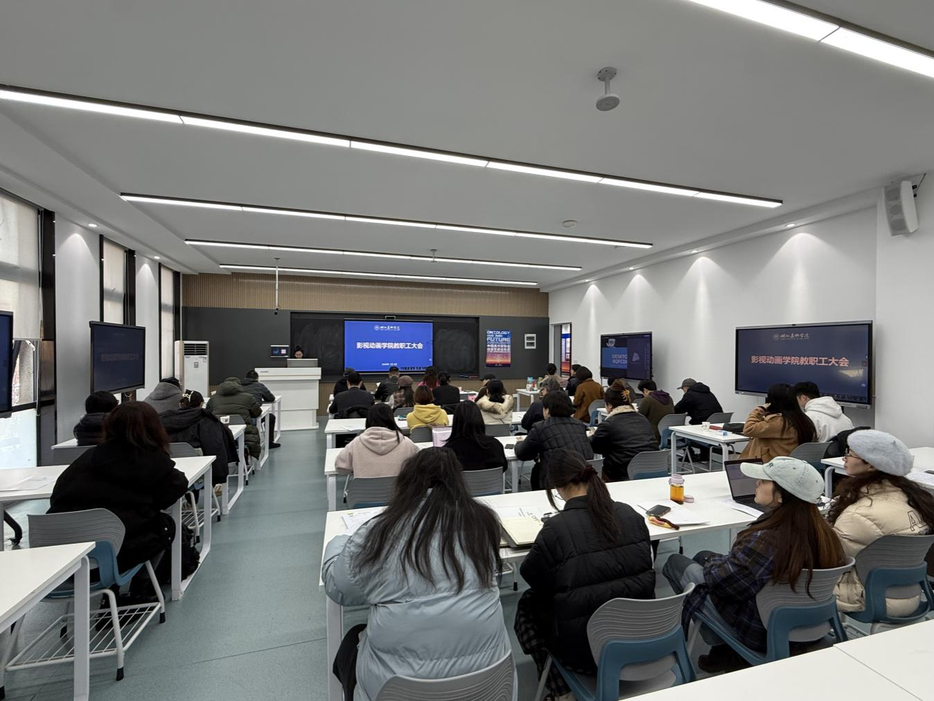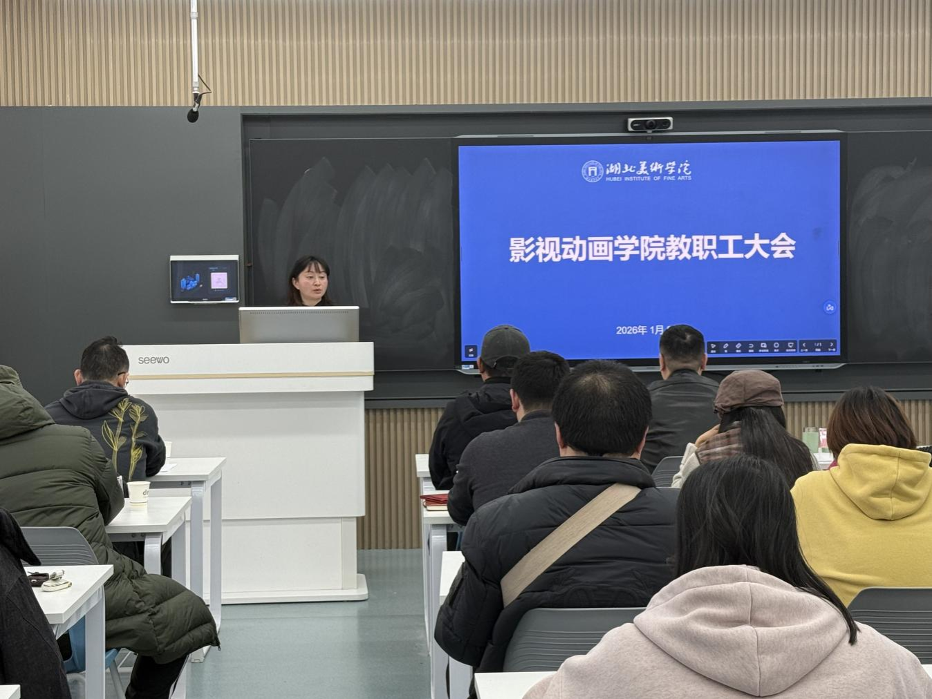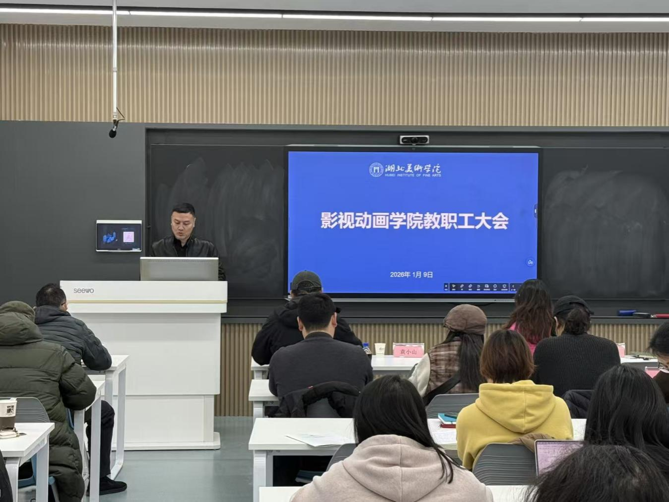 1月9日上午,影视动画学院2025年度教职工大会在A10-209举行。学院全体教职工参加会议,会议由影视动画学院党委副书记、分工会主席杨梓主持。