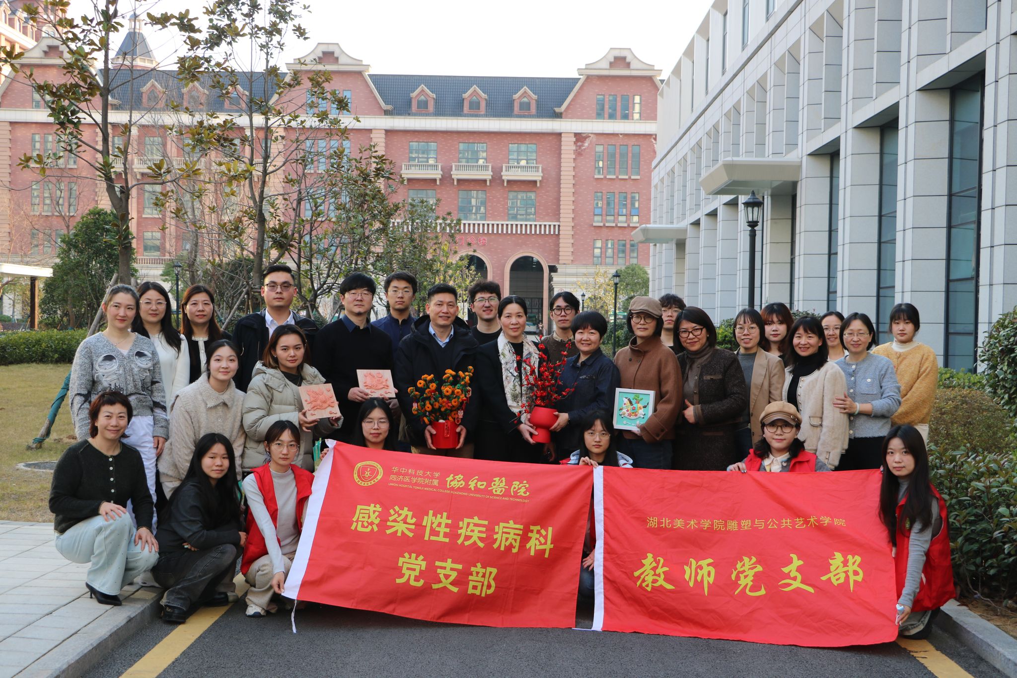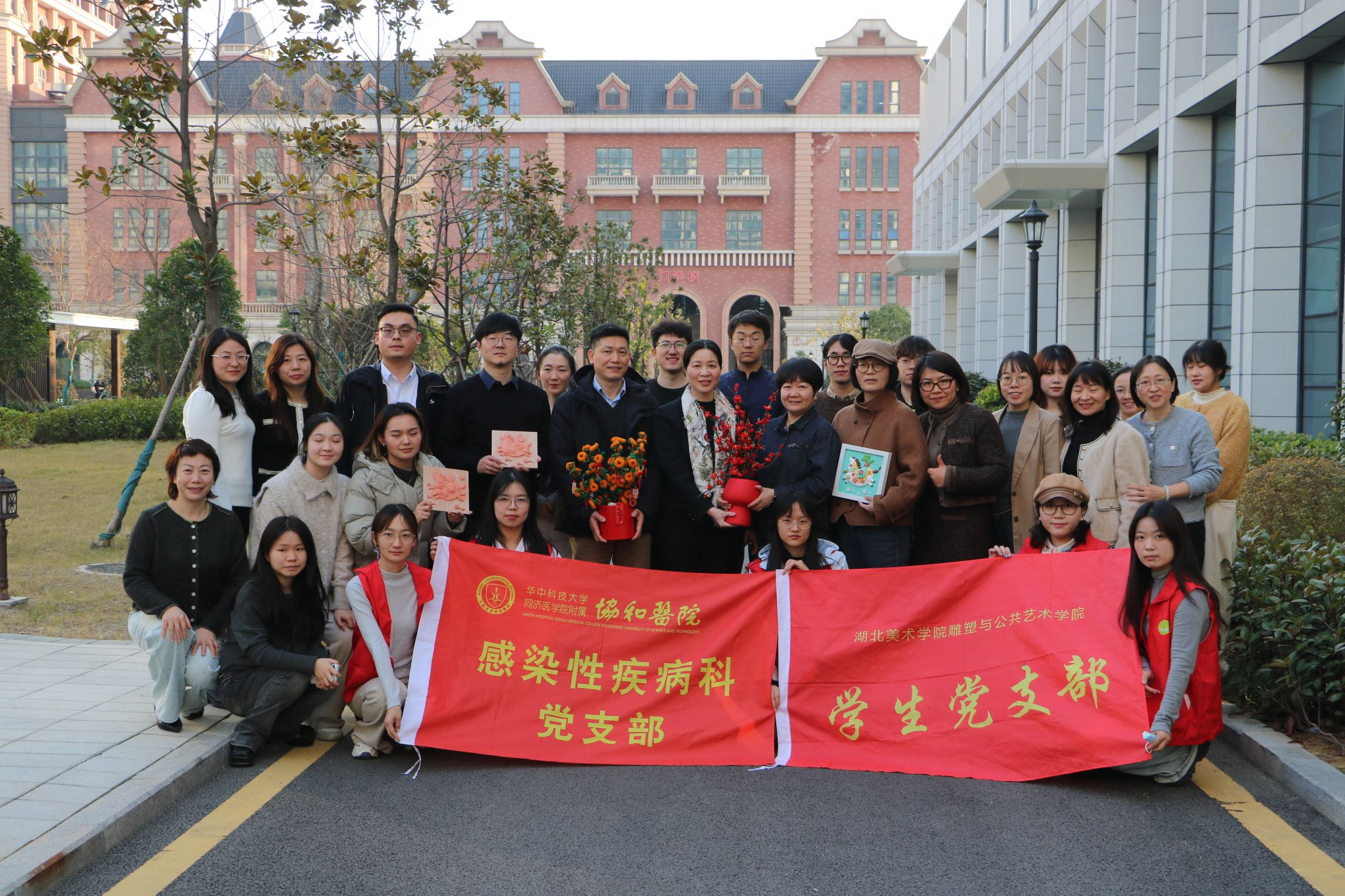 为深化党建引领,推动艺术与社会服务的深度融合,探索艺术与医疗人文的跨界协作,1月14日,湖北美术学院雕塑与公共艺术学院党委书记罗远红、副书记刘小荣、教师党支部书记谢荪、学生党支部书记吏希超、办公室主任陈玲率领师生团队一行20余人,赴武汉协和医院金银湖院区疾病感染科开展“艺润杏林 携手同行”党建艺术主题活动。武汉协和医院金银湖院区疾病感染科主任郑昕、支部书记卢银平、金银湖院区综合办主任王成,及相关医护人员共同参与活动。