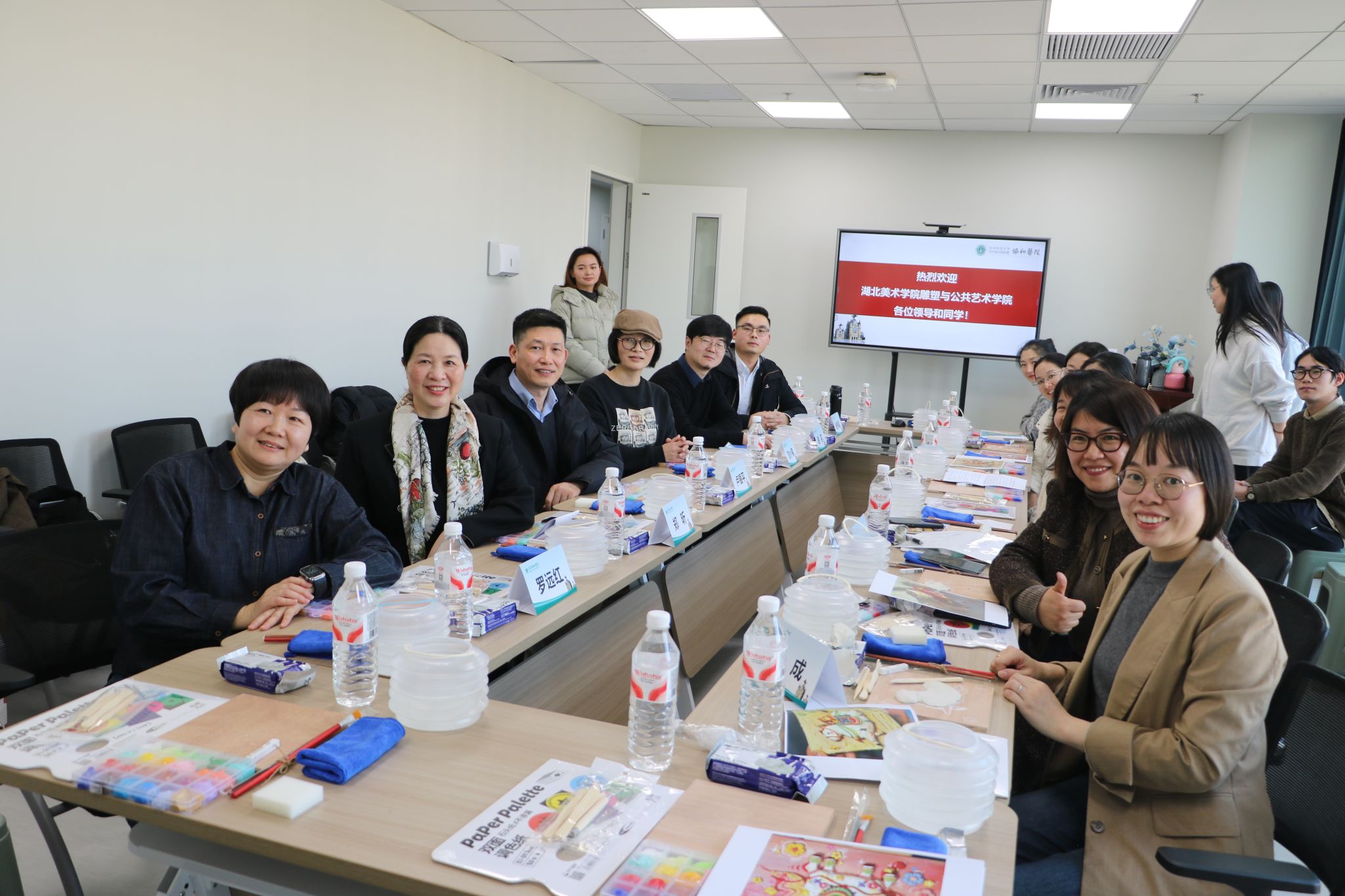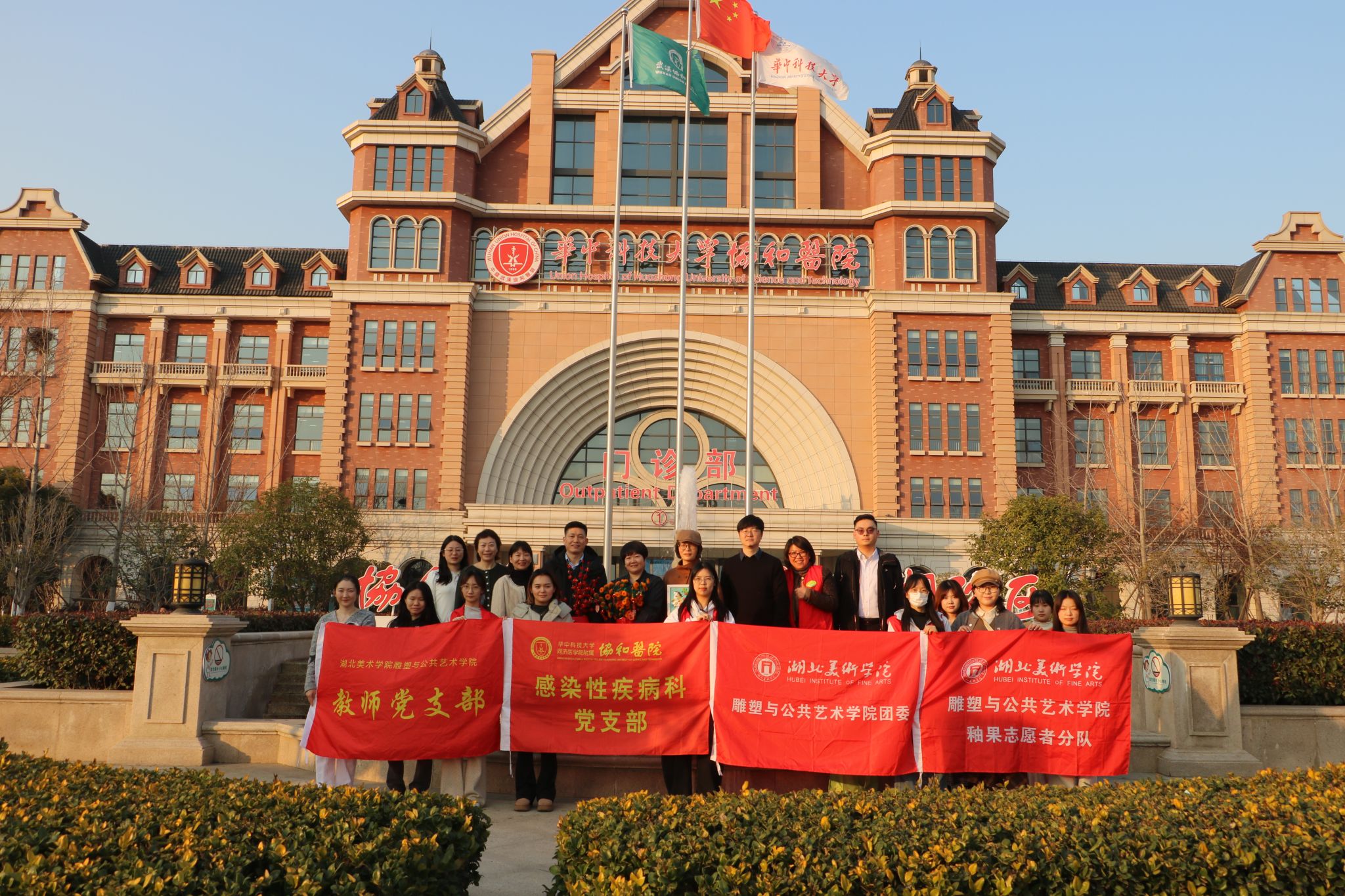 活动尾声,参加此次活动的双方人员纷纷合影留念,留下难忘的艺术记忆,未来,湖北美术学院雕塑与公共艺术学院与武汉协和医院金银湖院区疾病感染科将以党建为纽带,持续开展艺术创作驻留、空间美学改造、公共艺术展览等合作项目,让艺术成为联结医者与患者、院校与社会的桥梁,共同书写“以美育人、以美润心”的时代答卷。