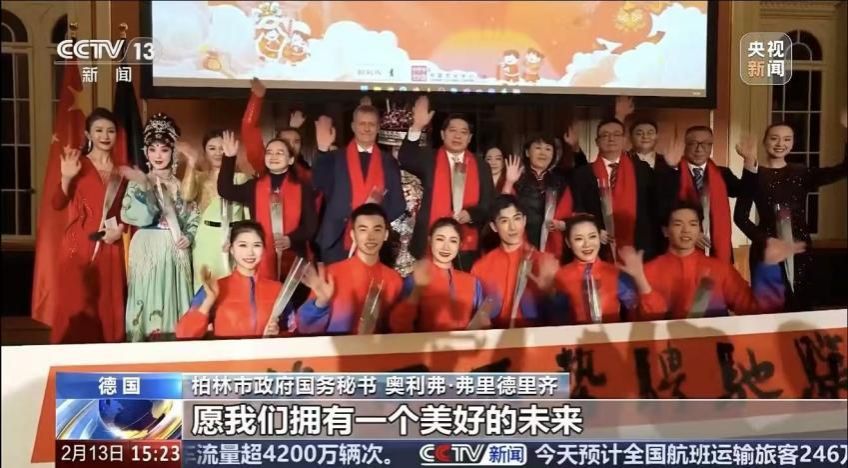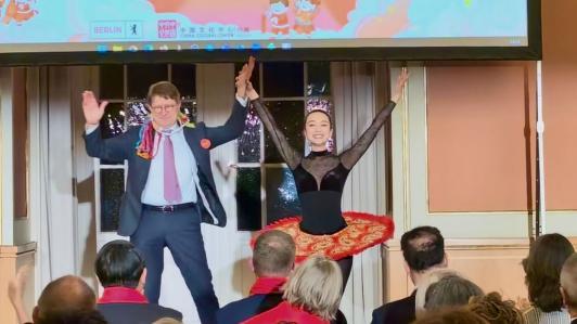 当地时间2月5日晚,由中国文化和旅游部主办,湖北省文化和旅游厅、柏林中国文化中心、柏林市政府合作举办的2026马年“欢乐春节”新春庆典晚会在柏林市政厅举行。中国驻德国大使邓洪波及夫人史玲、柏林市政府国务秘书奥利弗·弗里德里齐等300余位中外嘉宾出席活动,共庆中国农历马年新春。吴鹰在柏林市政厅惊艳亮相。在一片欢腾中,她现场邀请观众扬·施泰纳特共同表演,二人舞动之时,只见象征欢乐和谐的彩带凭空而出,“我完全没预料到会发生什么!”施泰纳特对新华社记者说。观众安德表示,他对魔术表演印象最深,赞其技巧精湛、互动有趣。吴鹰的表演将演出气氛推向高潮,赢得了在场观众的热烈欢呼。