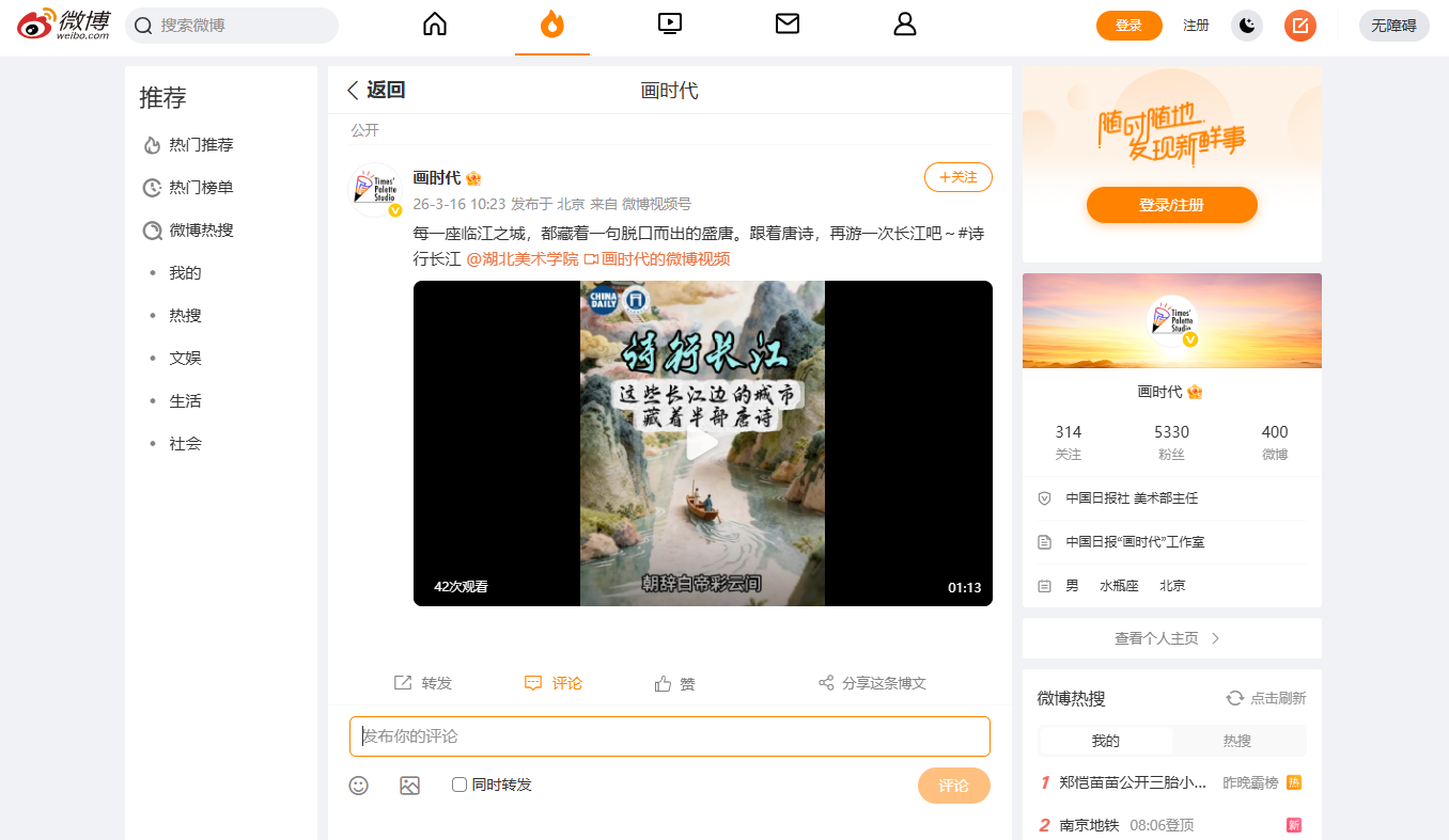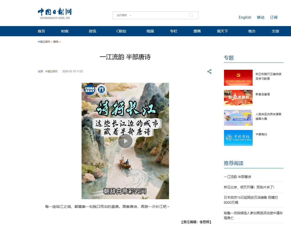 影视动画学院“动‘话’时代 艺绘中国”工作室《长江生态与人文》系列第六期作品《一江流韵 半部唐诗》在中国日报网、中国日报视频号、中国日报官方微博等多媒体平台发布。作品的成功发布,进一步拓宽了长江文化与生态保护的传播路径,让更多人通过动画这一喜闻乐见的形式,领略长江的生态之美、人文之韵,感受中华优秀传统文化的时代价值。