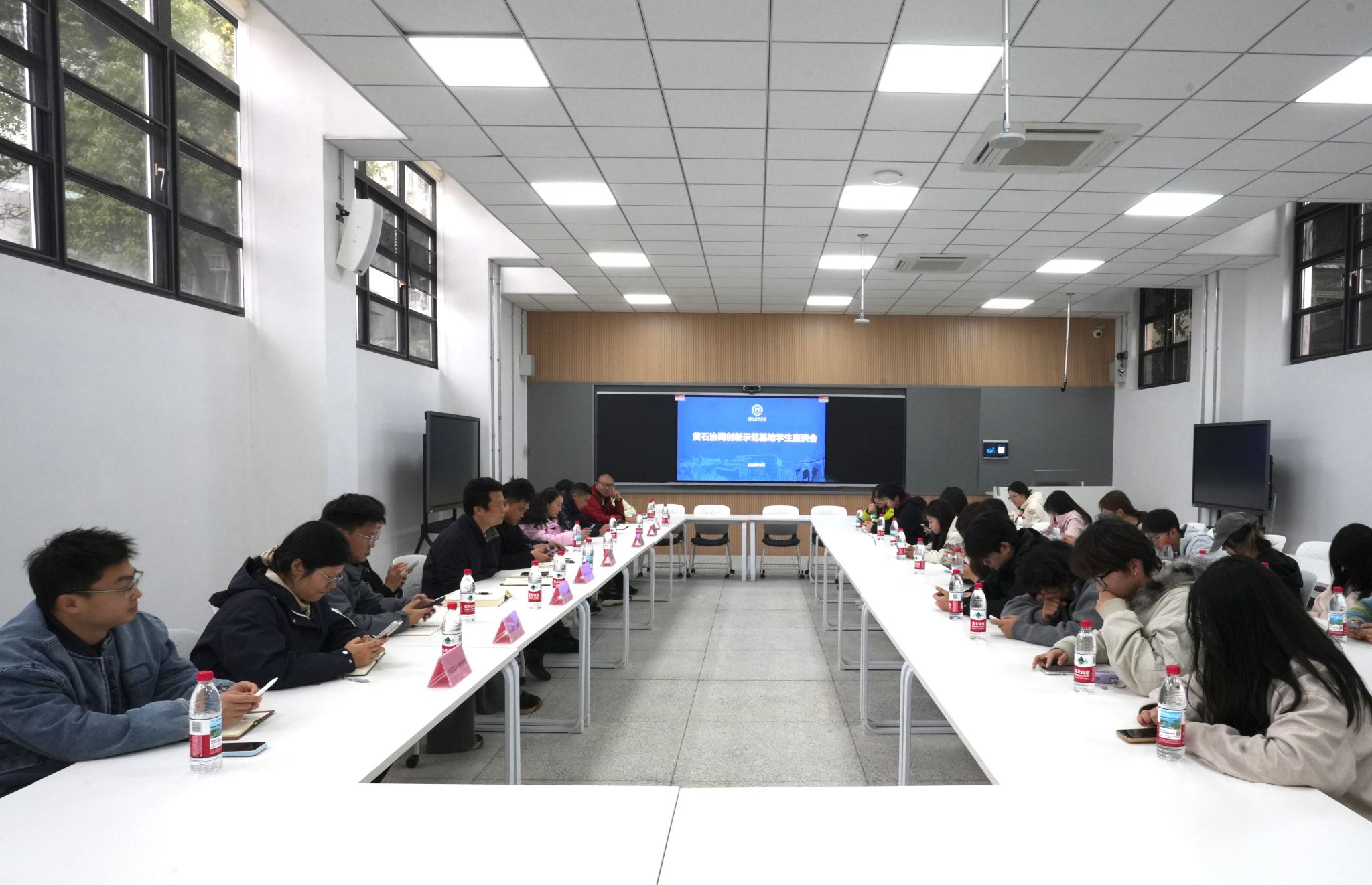 3月24日,黄石协同创新示范基地在教学楼智慧教室召开各学院学生代表座谈会,党委学生工作部、黄石协同创新示范基地及示范基地相关后勤保障部门负责人参加会议。