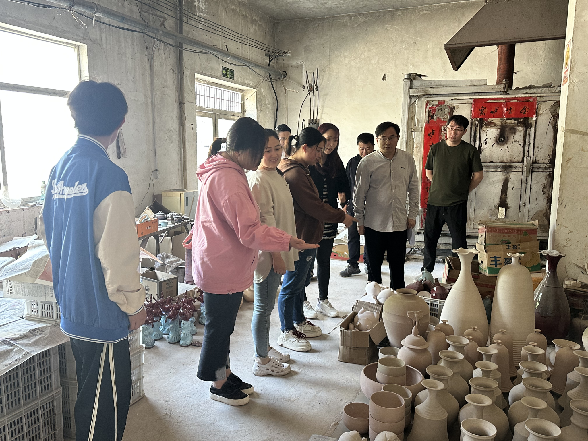在中国陶瓷艺术大师、东昇钧瓷艺术坊艺术总监李建峰的带领下,师生深入生产一线,实地考察钧瓷原料加工、成型、施釉及烧制等核心工艺环节,亲身体验国家级非物质文化遗产的独特魅力,切身感受钧瓷“入窑一色,出窑万彩”的神奇窑变艺术与匠心传承的艰辛历程。