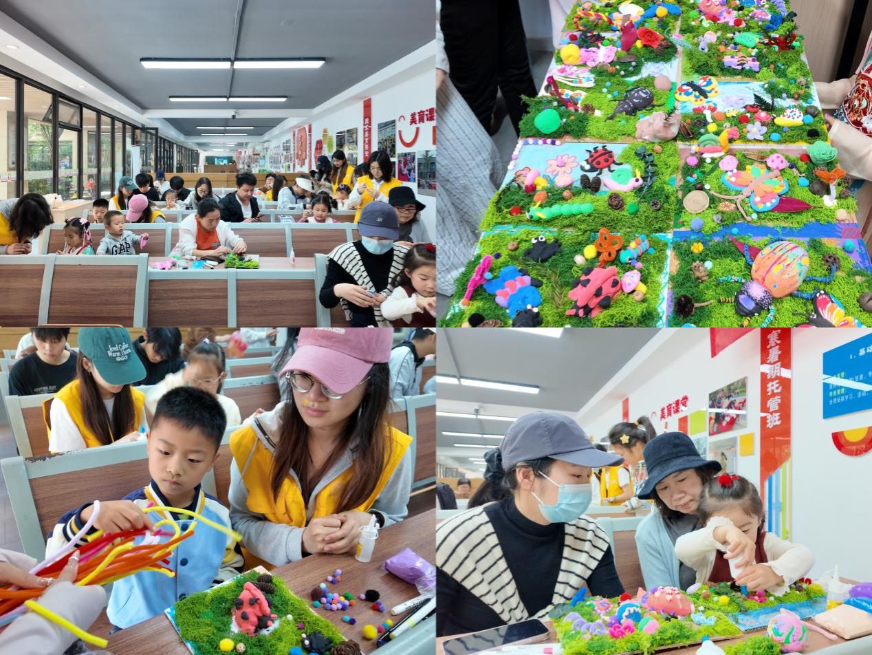 孩子们在捏塑、涂绘、拼贴的过程中,既锻炼了动手能力,也在艺术创作中加深了对自然的观察与理解。家长们也积极参与其中,与孩子一同构思场景、搭配色彩,亲子协作其乐融融。从黏土成型的昆虫到充满生机的湿地微景观,一件件作品栩栩如生,展现出孩子们心中对自然生命的热爱与想象。