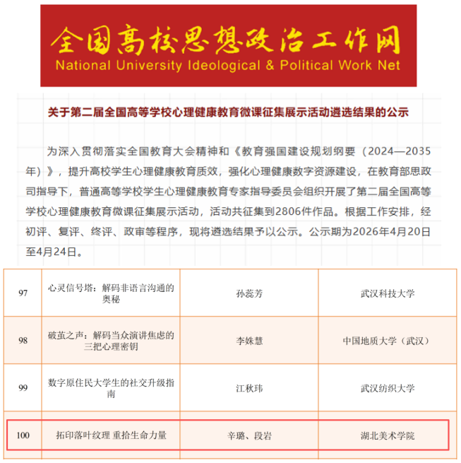 近日,普通高等学校学生心理健康教育专家指导委员会公布第二届全国高等学校心理健康教育微课征集展示活动遴选结果。我校大学生心理健康教育中心教师辛璐与艺术教育学院教师段岩联合创作的微课《拓印落叶纹理重拾生命力量》成功入选。