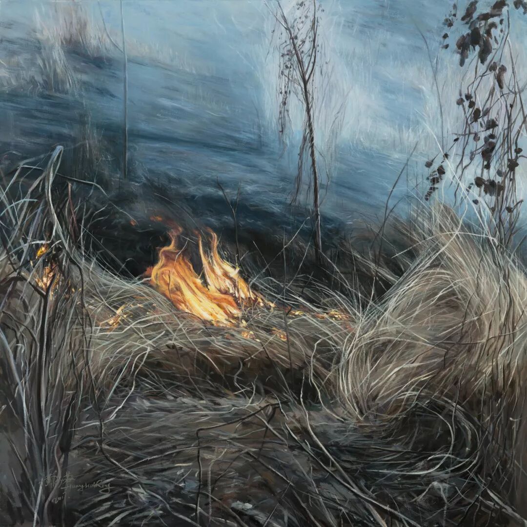 那同样虚幻的冒着蓝烟草灰的《别样绽放》,有种痛彻的伤感,似安塞姆·基弗那些幻想的大风景,给人以劫痛之后的悲彻与沉静;及至《尘本非尘》,那一片似雪花覆盖的灰烬才猛然让人醒悟“尘世”的深刻意涵。从《渍》《呼吸》到《别样绽放》和《尘本非尘》,黄海蓉都以个女性特有的敏锐视角切入了当代社会物质与精神、生与死这个有关人类生存与生命的哲学本题,肌肤的敏感与脆弱和草灰的轻浮与幻灭,在生命的体验上都无可争辩地具有着某种同一性,这也正折射了画家内心深处始终存留的那一丝易脆与柔软。但她又比许多女性更有批判的省思,《缺失的物象》系列看到了花儿娇嫩之后的凋零与残败,甚至于《风不止》已在离乱的草丛难觅鲜嫩的婆娑。生命之终结,对于富裕与贫穷、权力与奴役、高贵与卑微,或许本就没有差别,生命只是朵虚妄的鲜花!