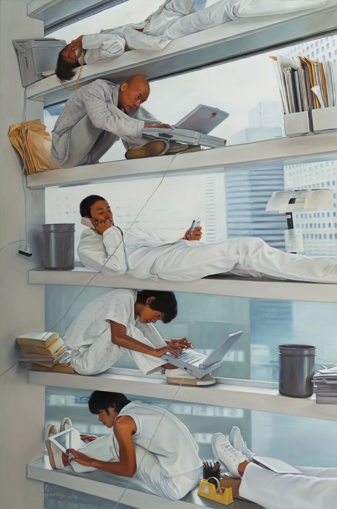 从日常视觉形象的叙述到非日常视觉经验的隐喻,是绘画从叙事到观念最鲜明的特征。记得黄海蓉入选第十二届全国美展的《智能时代》在现场评选时,评委詹建俊先生就问笔者,这幅作品表达了什么?作为评委的我,不假思索地说,这幅作品很真切地揭示了当代生活方式,我们每个人都生存在一个无形的看不见的逼仄空间,我们与这个世界的交流是通过电脑与网络实现的,这个看似智能的时代其实是把人装入盒子里进行虚拟生活,在某种意义上也剥夺了人与人、人与自然面对面的亲密接触。这幅作品当然很写实,但这种写实却不是现实生活中的日常形象,而是画家对我们所处的智能时代进行想象性的模拟与虚构。这幅作品显然已从日常叙事转向了某种绘画观念的探索。
