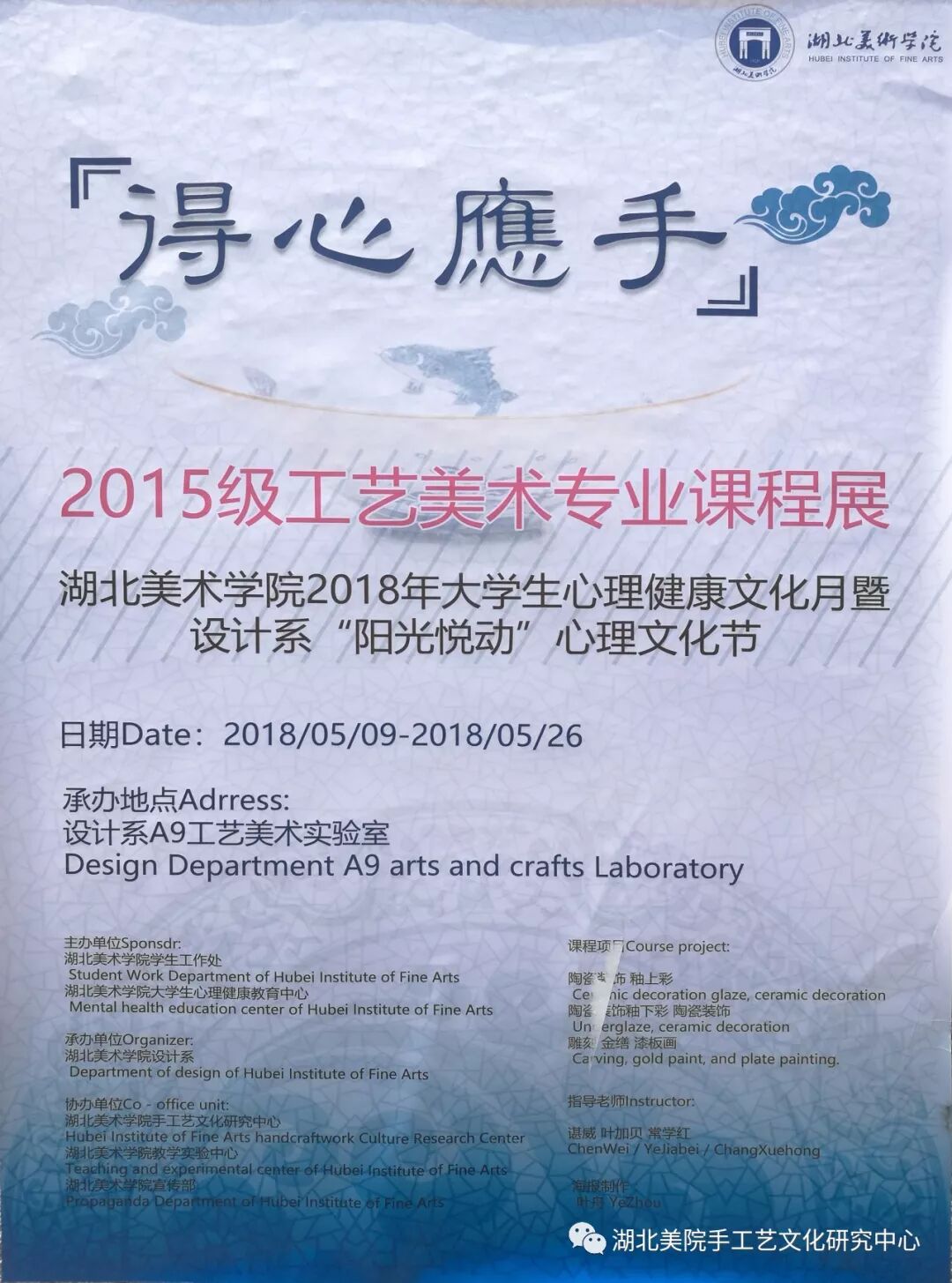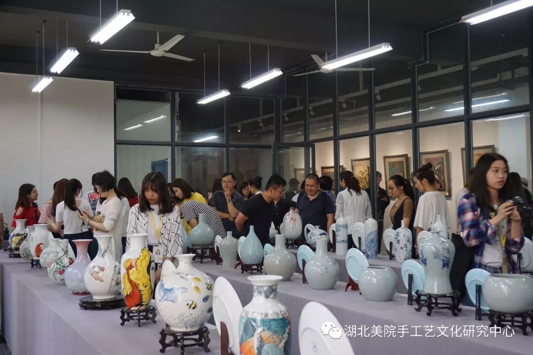 5月9日,作为湖北美术学院大学生心理健康文化月的重要活动,设计系“得心应手——2015级工艺美术专业陶瓷漆艺课程作业展暨展卖会”开幕式于设计系A9教学楼一楼大厅举行。活动由校学工部主办、设计系承办,手工艺文化研究中心参与协办,学校和各系部、相关职能部门领导以及教师代表出席开幕仪式并致辞。
