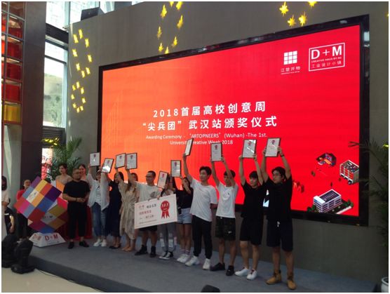 2018年5月16日上午,在武汉硚口D+M工业设计小镇举行了第一届尖兵团颁奖典礼活动。2018首届高校创意周“尖兵团——快爆48小时”通过48小时脑力风暴促进大学生设计思维及创客技能全面提升,让人才创新项目与产业面对面对接,转换学生创意价值。本次“尖兵团——快爆48小时”大赛活动主题为“智造武汉”,吸引了来自华中科技大学、湖北大学、湖北工业大学、湖北美术学院、中国地质大学及武汉理工大学的6所高校,7支队伍,共计61名学生参加。
