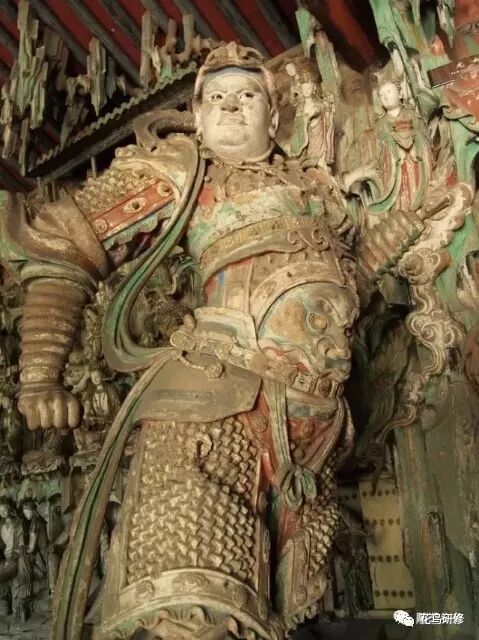 将量对称和势对称完美的融合在一起的典范单体雕塑案例也是有的,那就在我国山西平遥双林寺中的一尊明代韦驮菩萨泥塑像。优秀的造像者在塑造此韦驮的时候,将其头颈肩胸腹双腿以及脚的朝向扭转到不同的空间。造像者吸收了力士天王等护法神夸张的动态的张力,同时将戏剧表演艺术中武生在参差错落中平、顺、美的子午相定格姿态有机的运用其中。他以左脚为重心承载身体,右脚斜出成丁字步,似要趋步向前之时的后仰蓄势,腰部以上顺右扭转,上身向前微倾,下身向后靠,右手臂顺肩膀之势握拳后摆,左臂扬肘扛雷矢宝杵于左肩(法器缺失)。