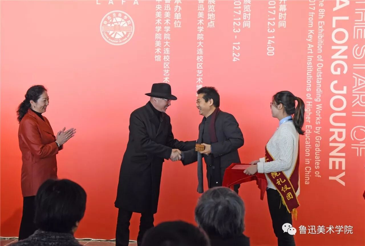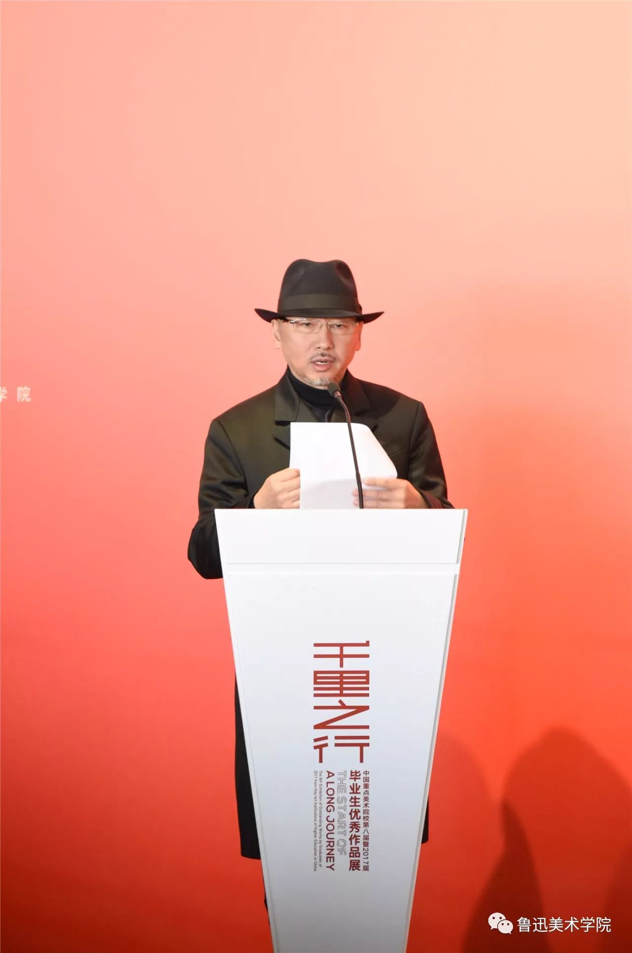 鲁迅美术学院院长李象群为开幕式做精彩致词。翰墨飘香,群贤毕至。经过数月的筹备和策划,我们在鲁迅美术学院大连校区迎来了一场文化盛宴——“千里之行——中国重点美术院校第八届暨2017届毕业生优秀作品展”。本次“千里之行”展由鲁迅美术学院承办,作为重点美术高校最高层次的教学展,可以让社会对中国高等艺术教育发展的现状有个更为直观的认识,也为社会大众提供了一次难得的、高水平的视觉盛宴。作为推介年轻一代艺术人才和考察艺术教育实践的平台,“千里之行”已成为展现中国高等美术教育水平与特色的最具影响与活力的学术品牌,坚持依然葆有各艺术院校的办学主张、专业特色和审美特质,这在展示现场可以观赏到,无论从专业教学及实践探索,还是在经济社会发展及文化驱动等方面都具有重要意义。“民之魂,文以化之;国之魂,文以铸之”。在当前我国深化改革,推动经济社会发展和辽沈地区掀起的新一轮振兴东北老工业基地的形势下,文化创新驱动发展是赋予艺术院校的时代使命。“千里之行”作为一个重要的交流平台,是中国艺术教育不可多得的一次学习和交流的机会,必将更好地带动和引领我们的艺术创作,同时也将通过本次活动的倾力承办,将“千里之行”这一具有品牌效应的活动做得更加坚实,更具影响力。衷心希望广大艺术院校的毕业生,继续发挥聪明才智,创作出更多、更好的艺术精品,为繁荣我国的文化事业和文化产业,提供强有力的支持,并做出卓越的贡献。最后预祝“千里之行——中国重点美术院校第八届暨2017届毕业生优秀作品展”圆满成功!