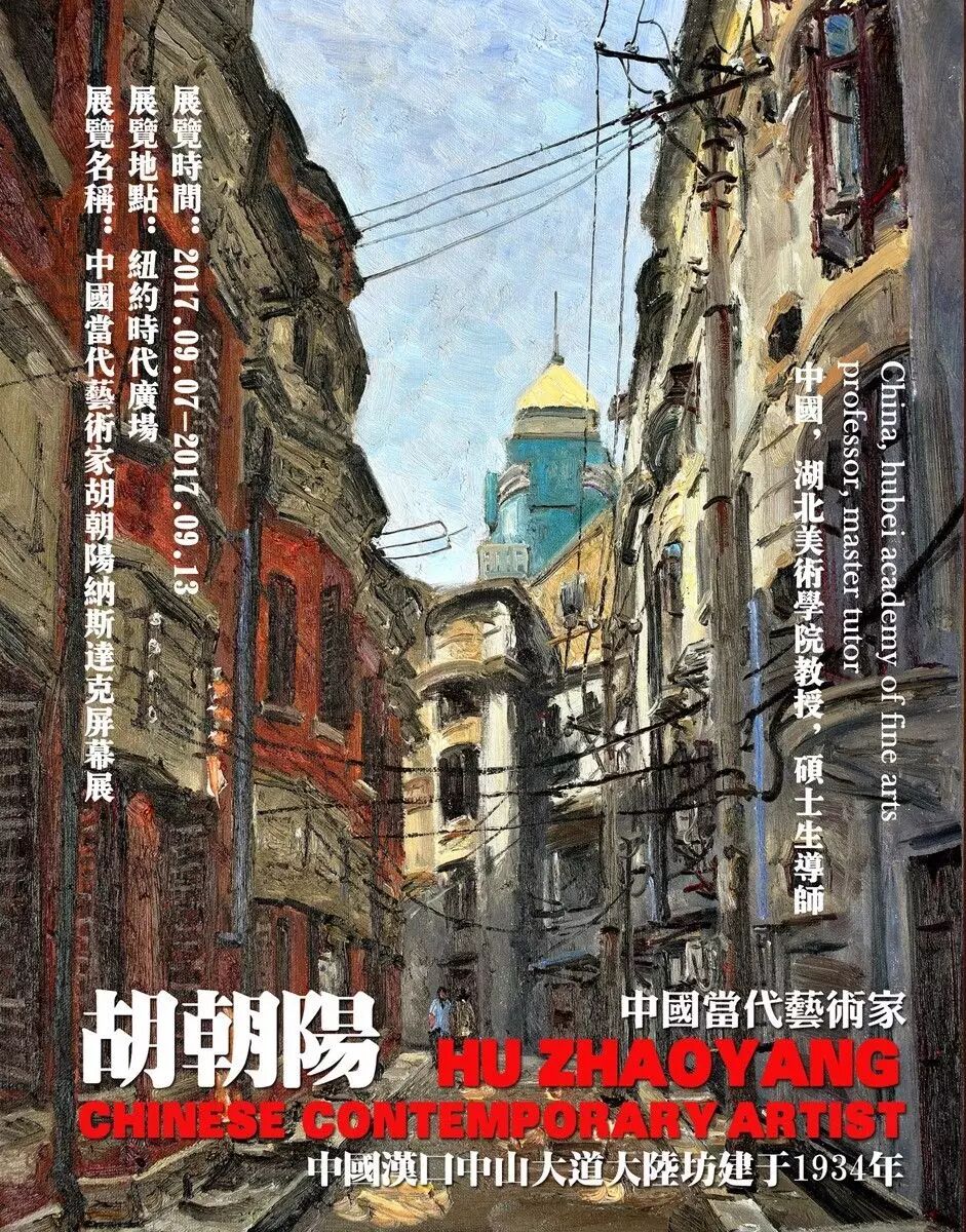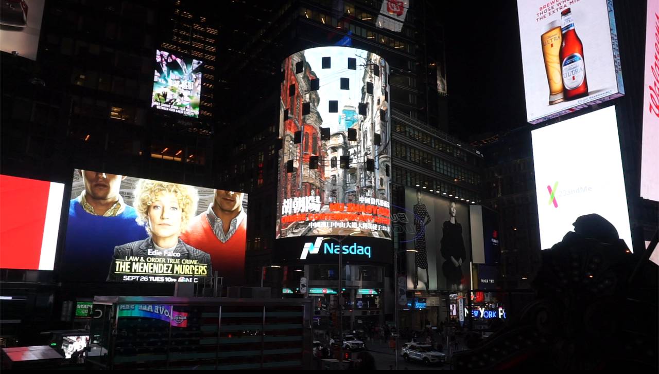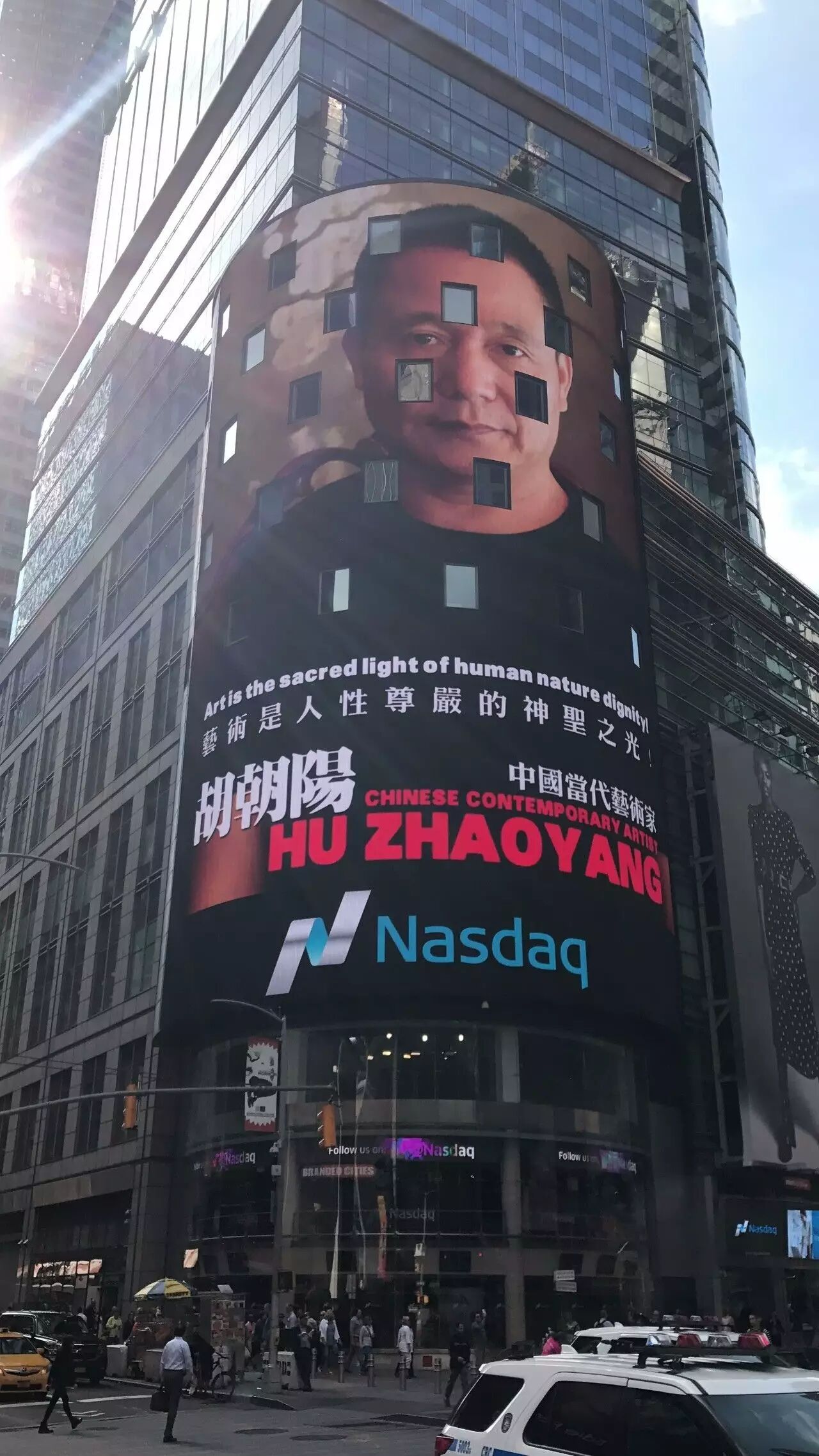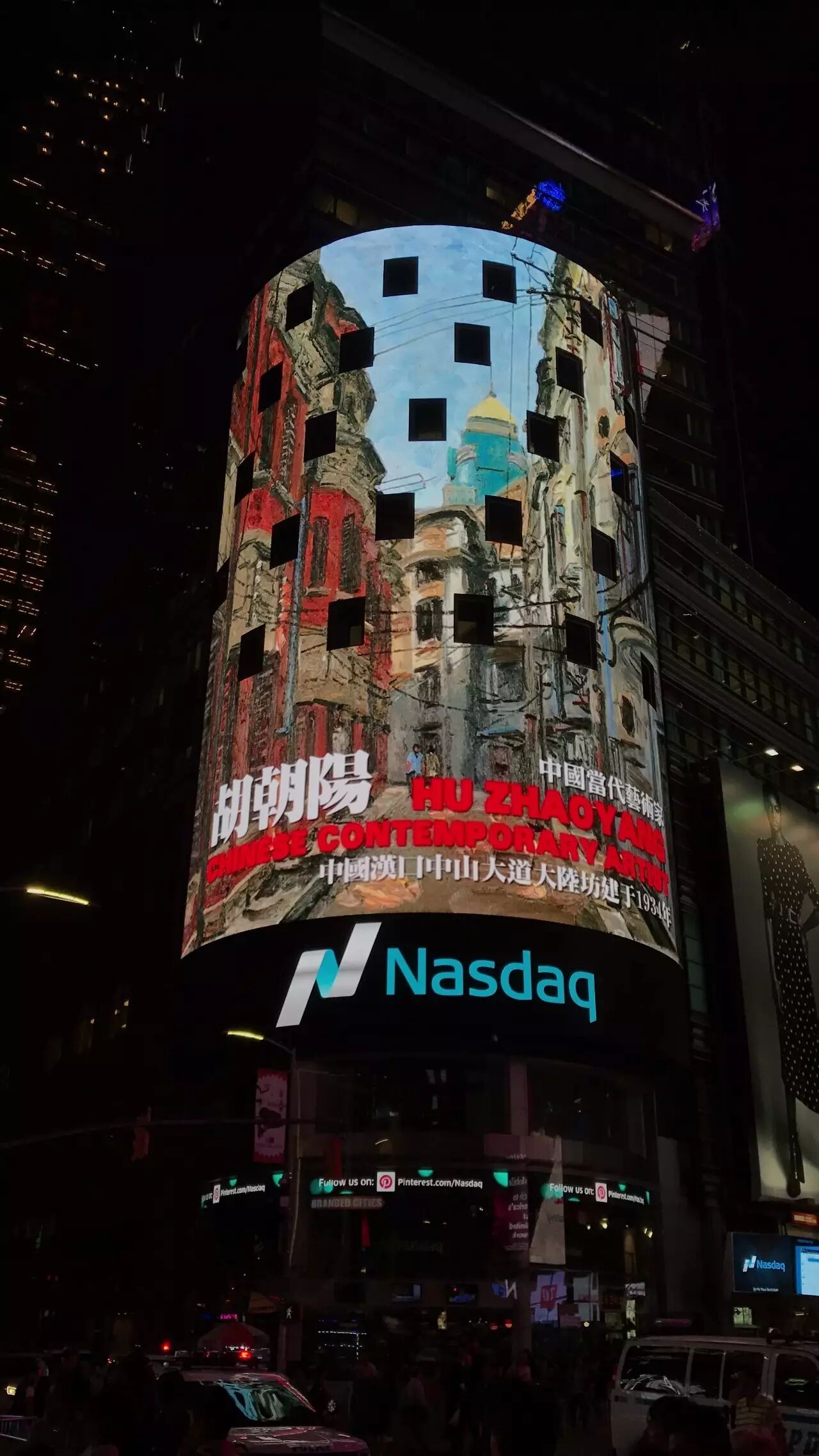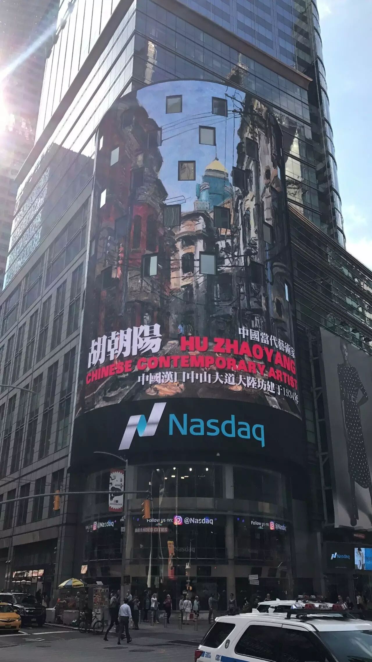 纽约时间2017年9月7日至9月13日,中国当代艺术家胡朝阳的作品《中国汉口中山大道大陆坊》与他的东方艺术家面孔出现在纳斯达克大屏幕上。