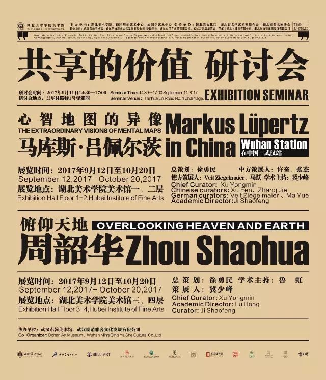 2017年9月11日14:30, 共享的价值:“心智地图的异像—马库斯·吕佩尔茨在中国”与“俯仰天地—周韶华”双个展学术研讨会在翟雅阁博物馆(昙华林艺术区武汉设计之都促进中心)召开。