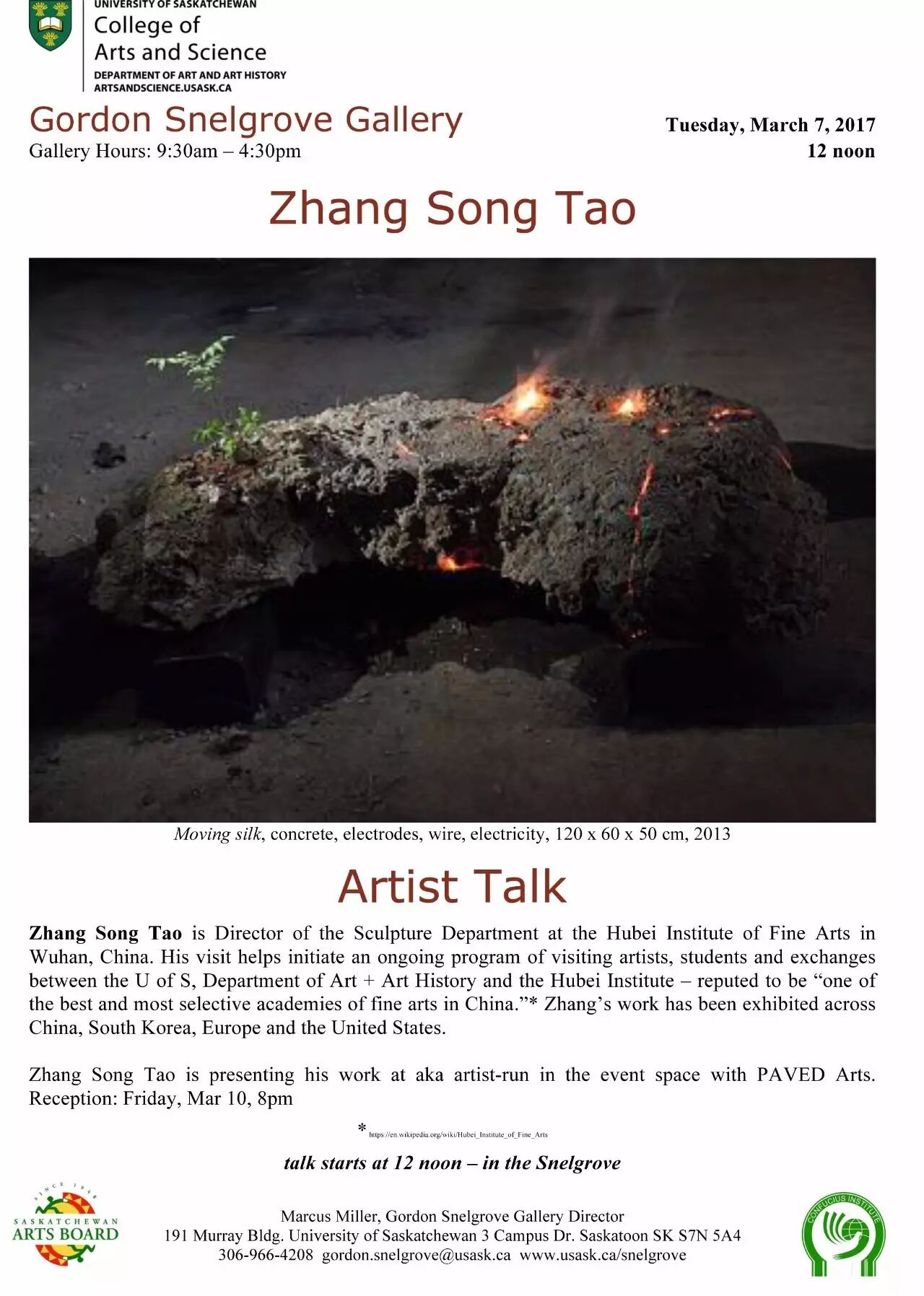 2017年三月,湖北美术学院雕塑系主任张松涛教授应邀赴加拿大萨斯喀彻温大学艺术与艺术史系(the U of S, Department of Art + Art History)进行为期三周的学术访问和驻留计划。在访问期间张松涛教授考察了艺术系课堂教学和教学设备、工作室(studio)硬件设施;参与研究生与本科学生的课堂教学在雕塑工作室和学生一起研讨作品并进行创作;举办学术讲座和个人作品展览。