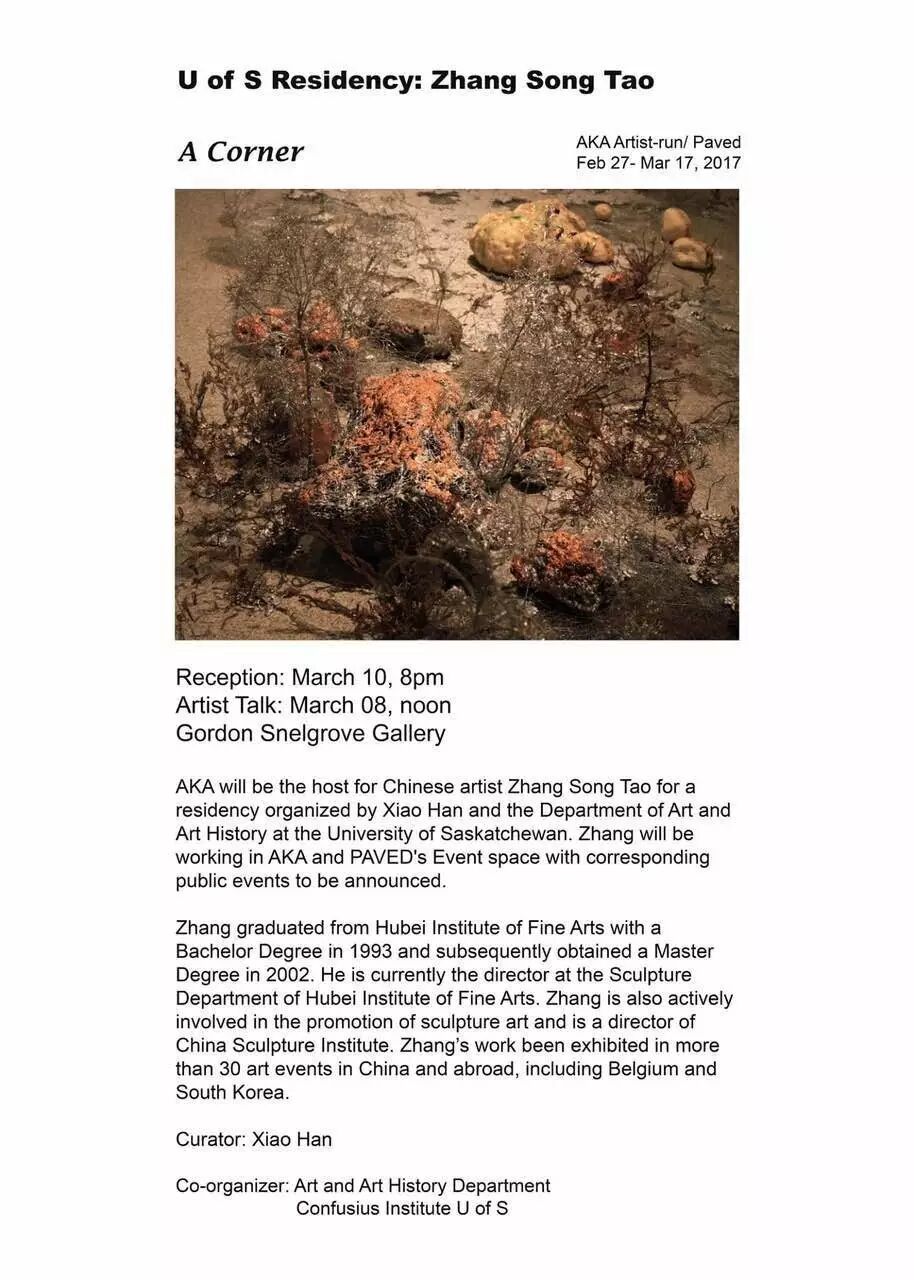3月10日晚由萨斯喀彻温大学艺术与艺术史系(the U of S, Department of Art + Art History)和孔子学院联合举办的“A CORNER”张松涛个人作品展览开幕式在萨斯卡通市AKA ARTIST-RUN 艺术馆进行。展期:2017年2月27日至2017年3月17日。