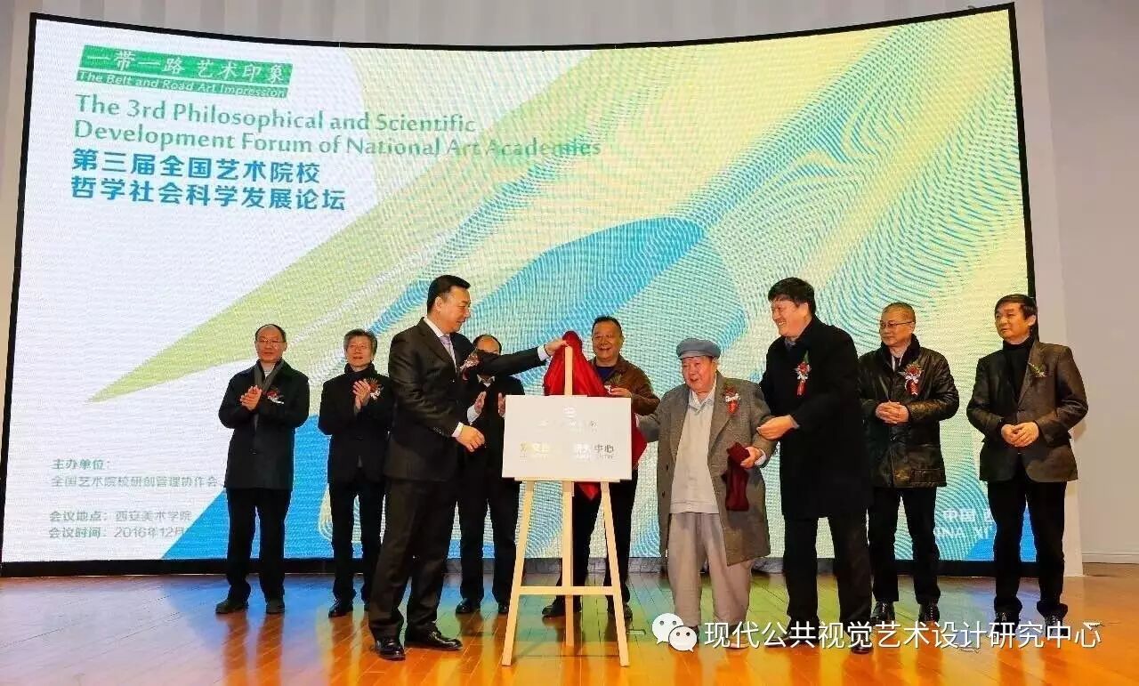 在论坛开幕式上,张东刚、邓理、董小龙、王建利、范迪安、许江、王家春、郭线庐一起为西安美术学院“刘文西艺术研究中心”揭牌。