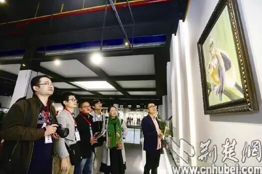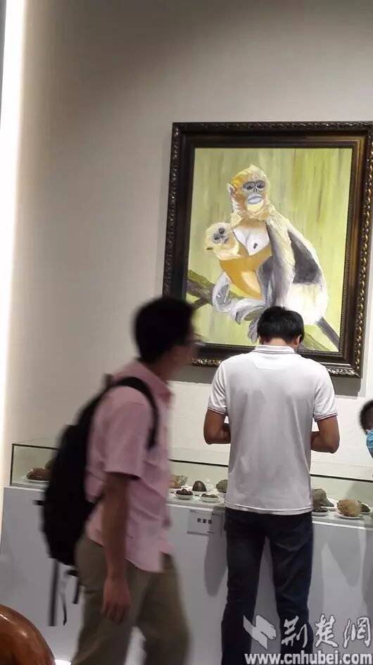 ▲图为湖北省园博园主展馆游客观赏油画《爱·金猴母子》