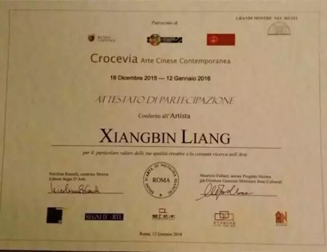 ▲图为意大利罗马政府、拉齐奥大区政府、维多尼奥国家美术馆、中国驻意大利大使馆、艺术痕迹等联合为梁相斌先生作品颁发的展出证书。右边为意大利文化部长签名。