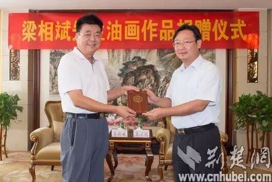 ▲图为梁相斌向湖北省(黄石)园林博览会组委会副主任、黄石市人民政府市长董卫民捐赠油画作品