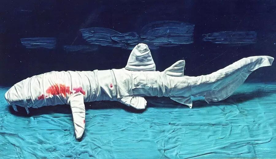 刘剑在他的包裹系列中以这种捆绑包裹的作品来制造一种梦魇。用极为精彩的写实技法完成他精神上的折射和内心对人类、对世界的感悟。他的《命运·海洋》《命运·鲸》《种子》《向日葵》…,画白沙布包裹而渗血后沉入海底的鲨鱼;画白布包扎而挣扎着冲出海面的鲸;画干涸的土地上散落着枯萎的星状生物和枯燥龟裂的花盆中伸向天空呼唤的绿色巨手;刘剑画一片金黄色的向曰葵,个个被黄布捆绑包裹着仰天候望等等。在他的塑料袋系列中《塑料袋·生活》《塑料袋·人体》…则是关注人类命运主题的扩展。是在更加深刻的层次上对生命存在价值的体悟,它所包含的主题也许用一个词汇无法涵盖。从这个角度来说,画家的追求在深入,内容的阐释更完备,解剖社会人生的视角更独特,技术形式的把握更充分。将塑料袋与女人体两种符号元素组合,塑料袋在这里有了新的象征意义,它是笼罩着的密不透风的云,是分隔着两界的屏障,是令人痛苦的桎酷,是人性中不可或见的隔膜,于是形成了画家对现实社会的特有认识,他用这种复合符号阐释和解读了当今社会的状态,深层次地表达人与现实的强烈冲突。这里不是漫骂,不是激愤,而是超现实主义的陈述,给我们较多的遐想和冷静的思考。