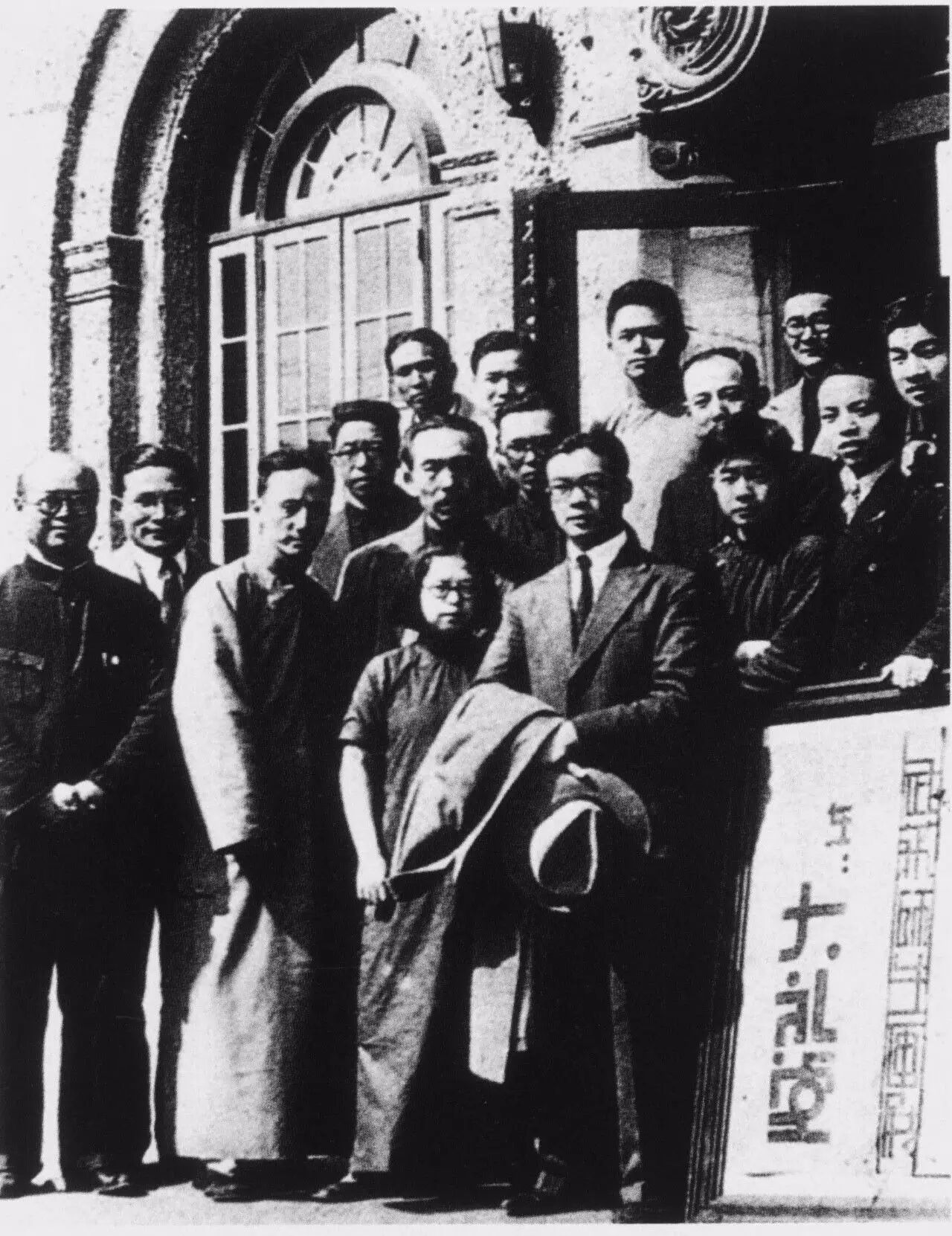 1936年第二届全国美术展览时,武昌艺术专科学校的校长唐义精(前排左一)与教授蒋兰圃(前排左二)、唐一禾(前排右一)及部分学生在展览厅前合影